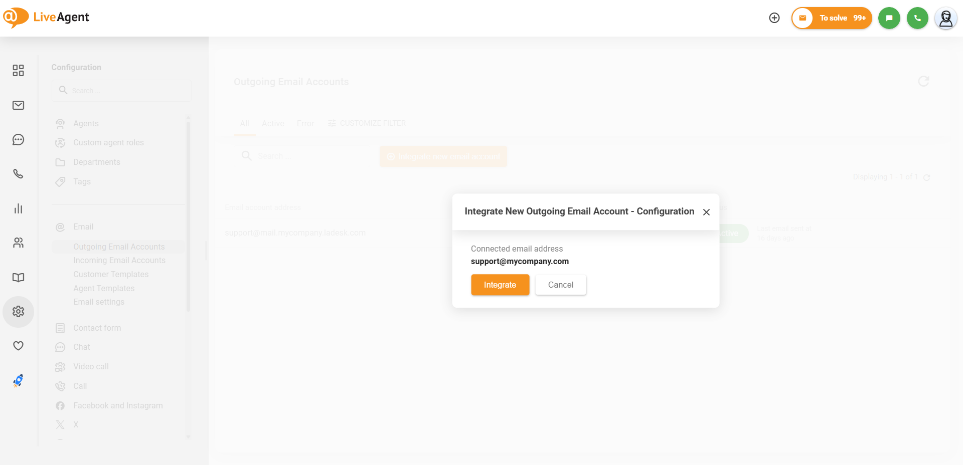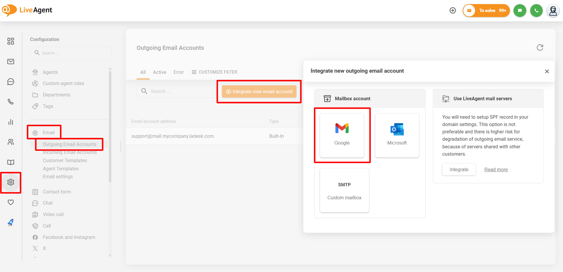 To connect a Google address to LiveAgent to be able to send emails from it, navigate to Configuration > Email > Outgoing Mail accounts, click "Integrate new email account", and in the connection window select the "Google" connector.