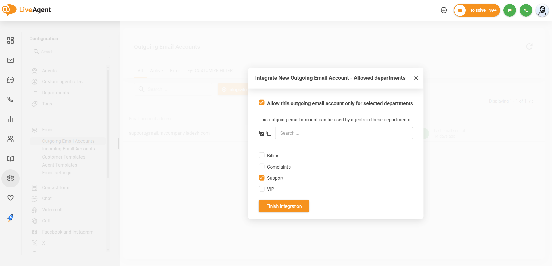 Lastly, decide whether the connected outgoing email account should be available for all departments to send emails from it, or whether it should be restricted and available only for selected departments.
