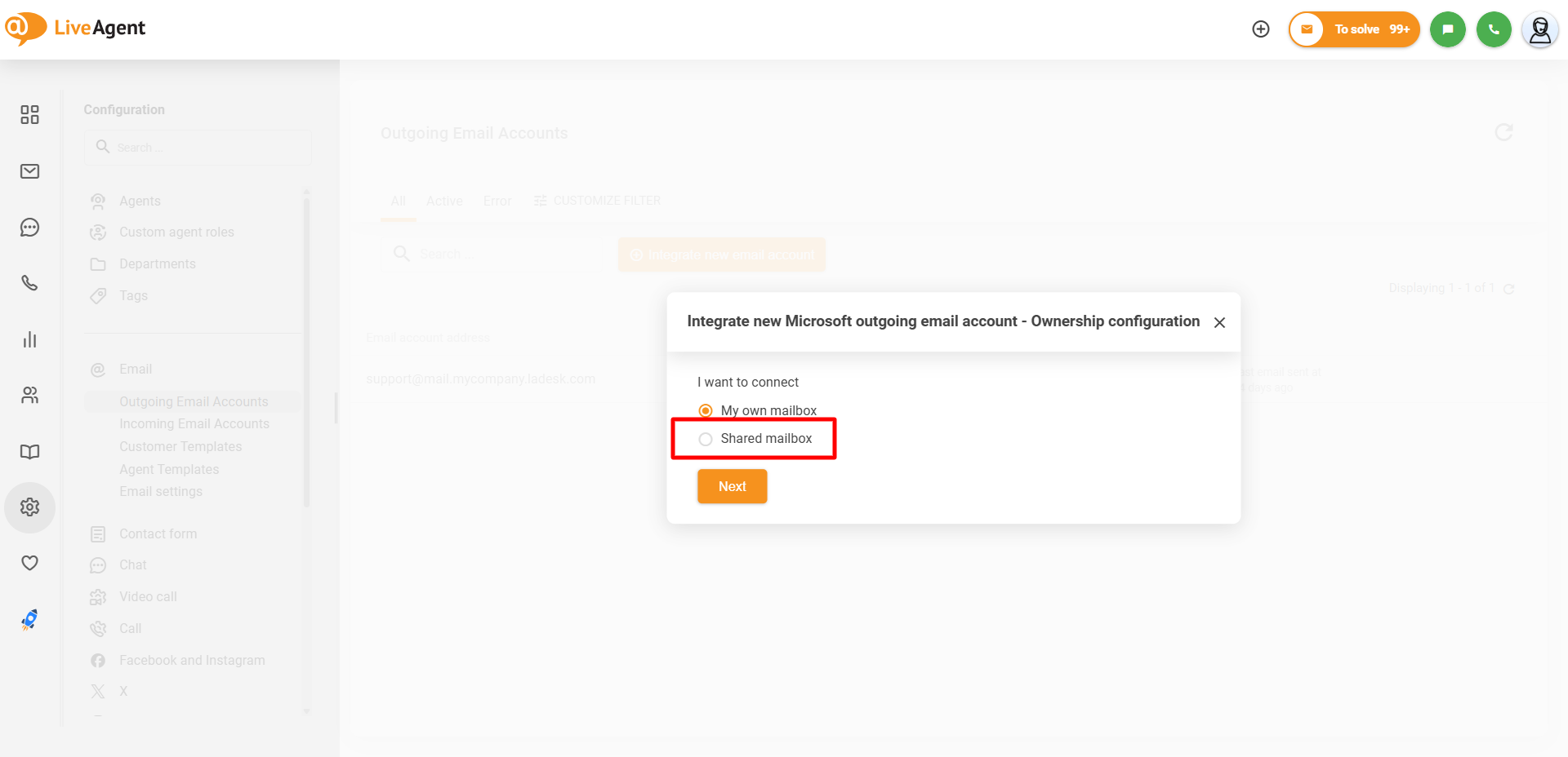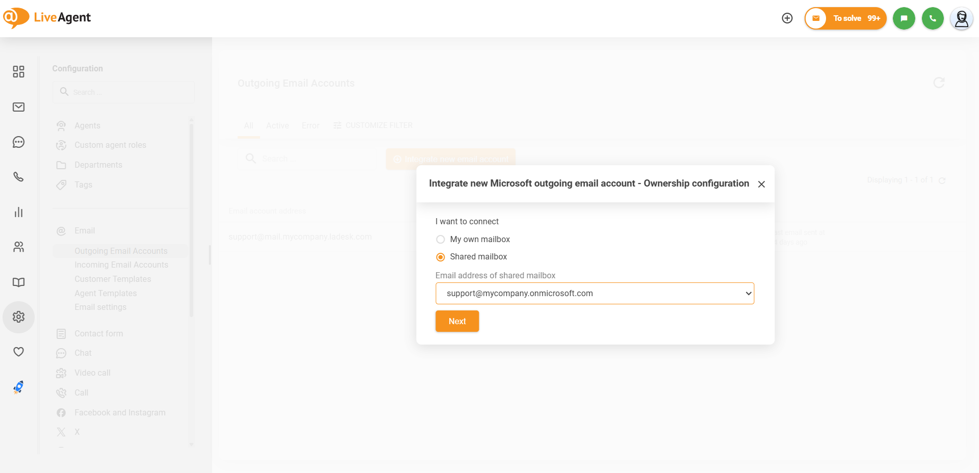 Once the consent is granted, you'll be able to select the shared mailbox you want to connect as an outgoing email account to LiveAgent.