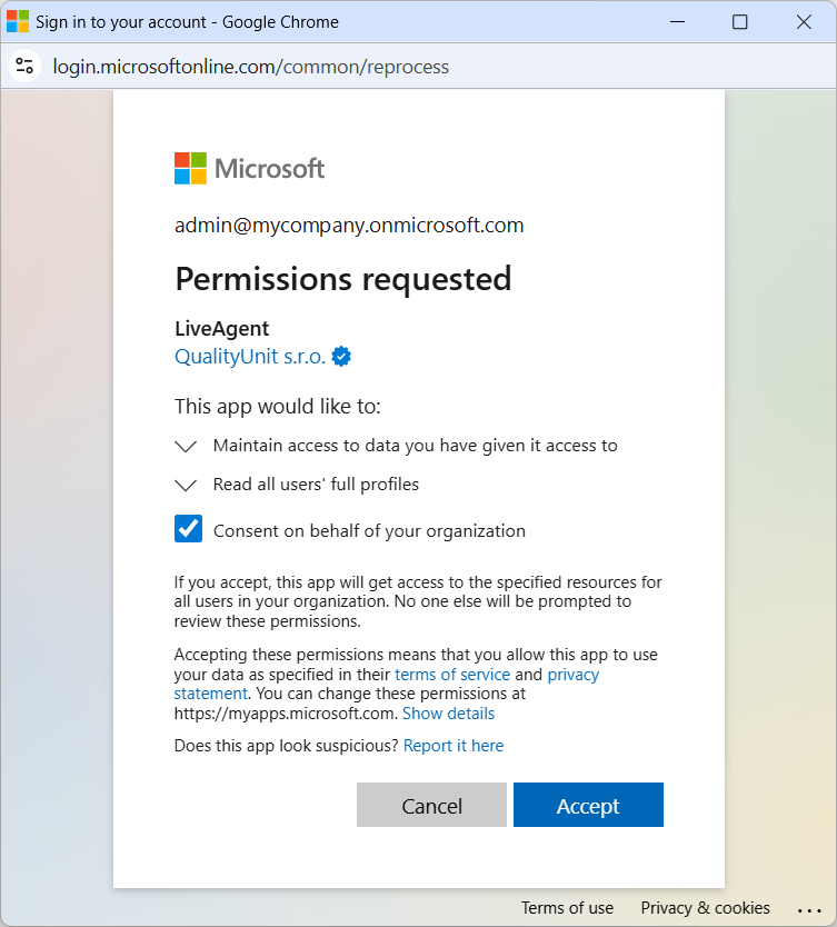 Microsoft Global Admins can grant LiveAgent a tenant-wide consent to allow any Microsoft users connect shared mailboxes to LiveAgent. This consent can be granted right away from the authorization window.