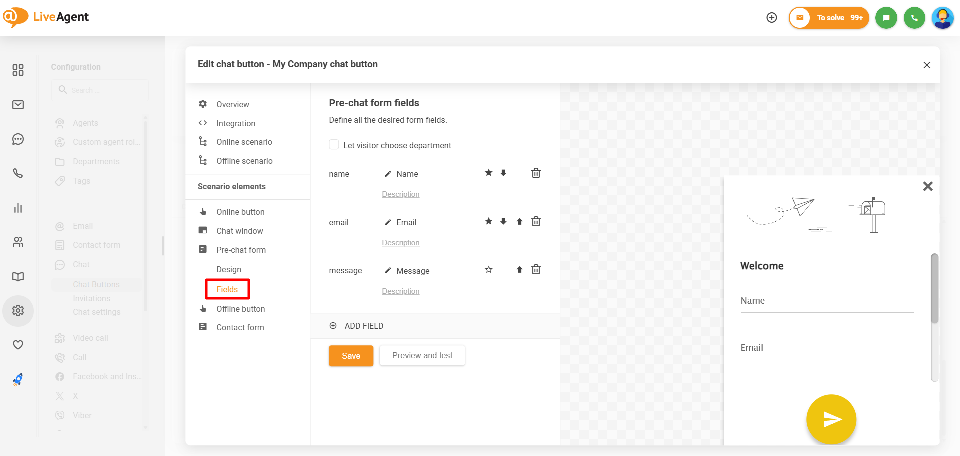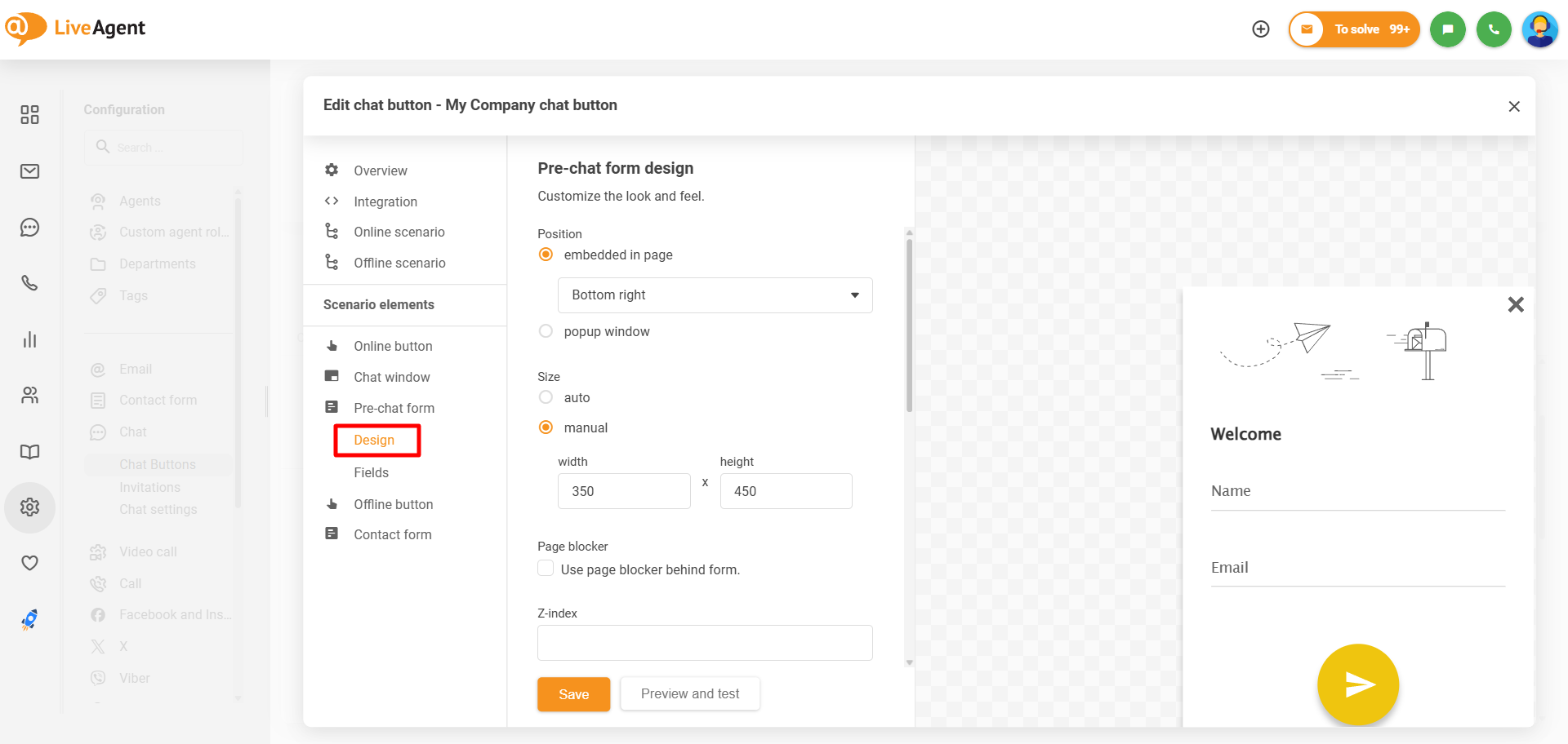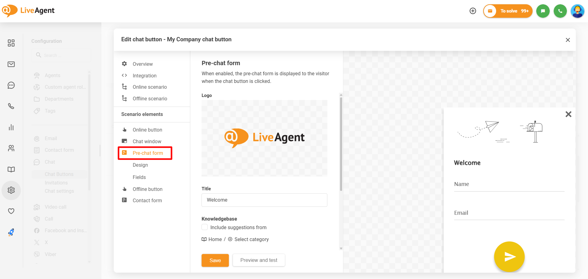 Before saving any changes, you can use the Preview and test option to check how the pre-chat form looks and behaves. This allows you to fine-tune the design, fields, and content without affecting the chat button that is already active on your website.