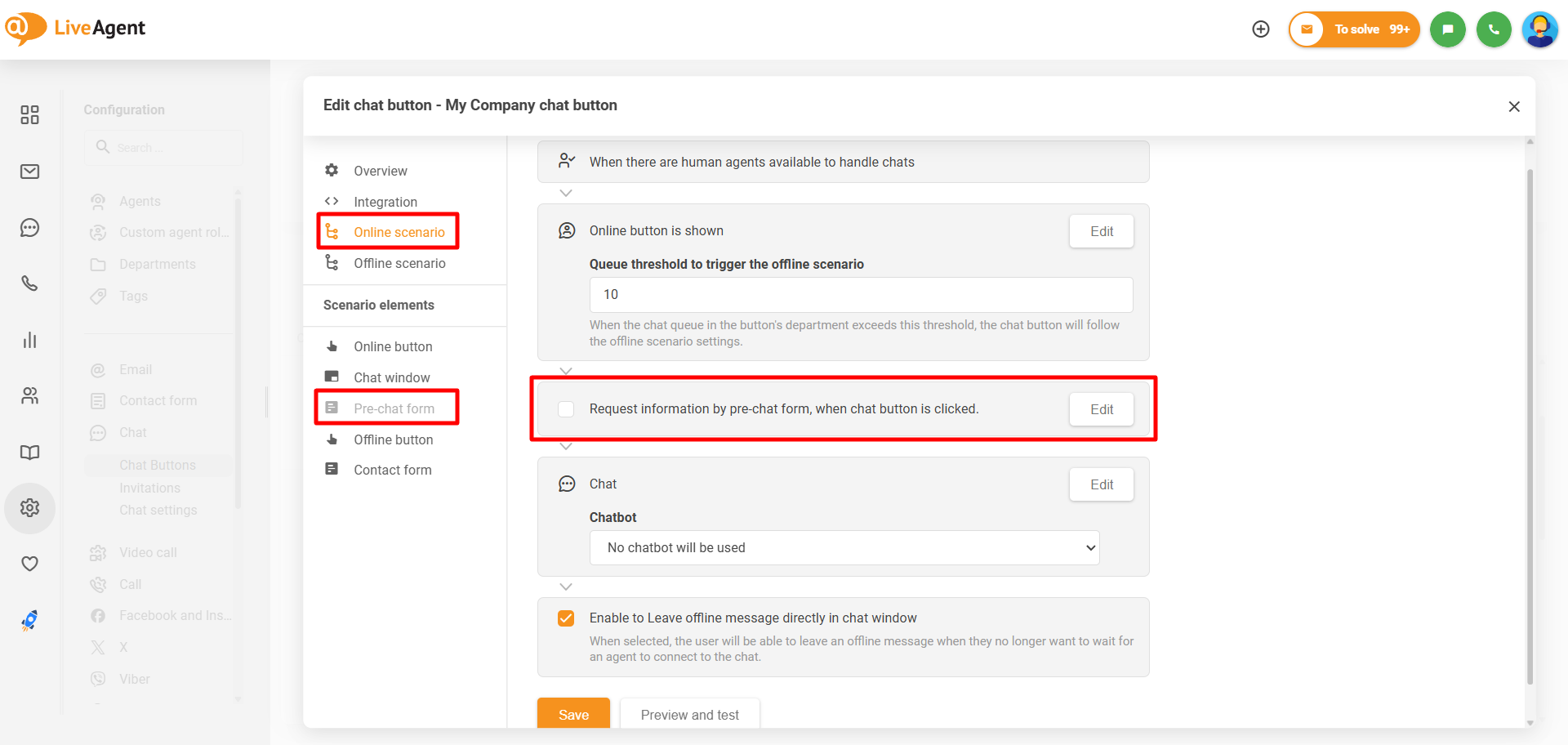 Choose the chat button you want to edit (or create a new one) and click Edit. In the left menu, select Online scenario. Find the option Request information by pre-chat form, when chat button is clicked and check the box to enable it. You can also click Edit next to this option to open the pre-chat form settings directly.