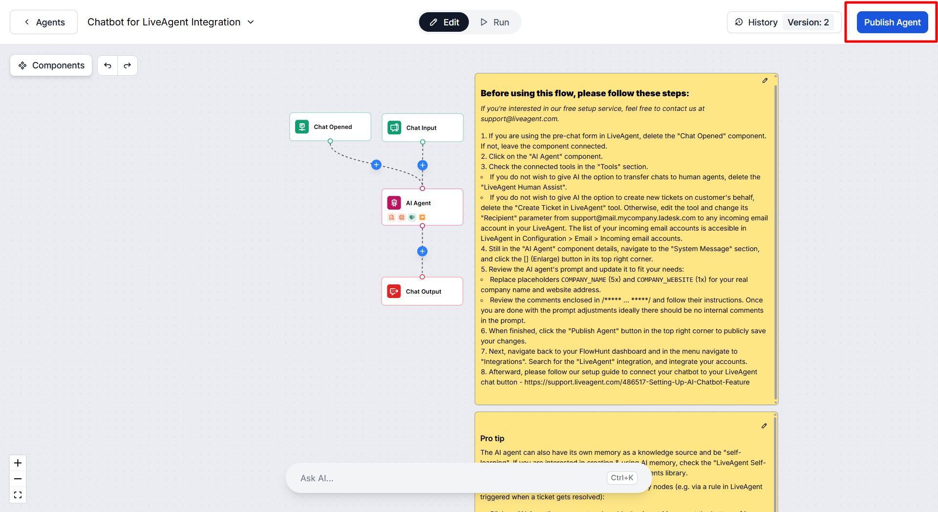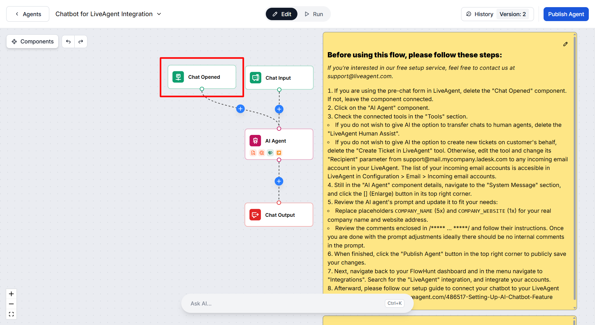 To be able to use the AI chatbot feature, it is required to integrate your LiveAgent account with FlowHunt.