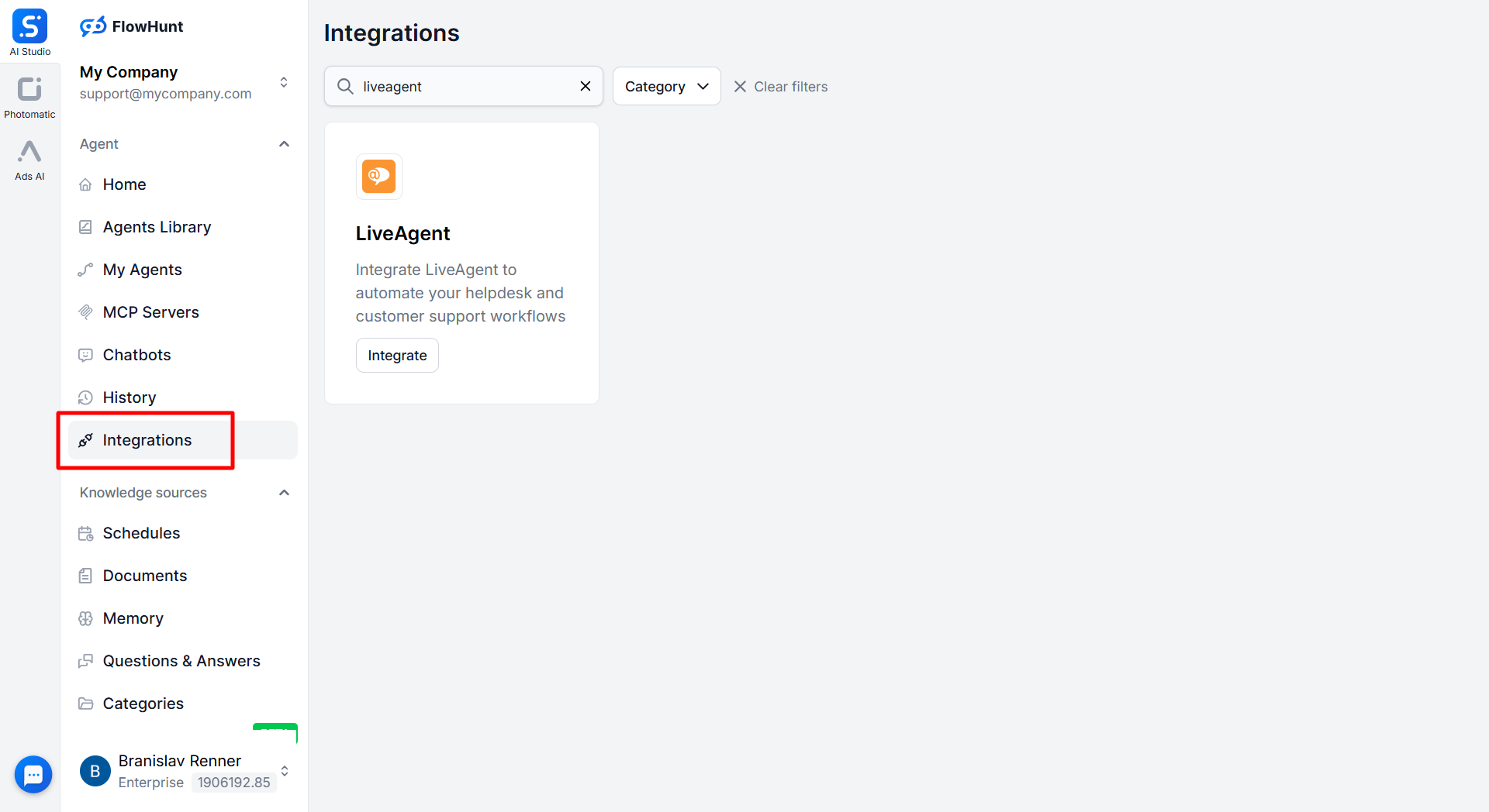As the last step, click on the "< Agents" button in the top left corner to navigate back to your FlowHunt dashboard, and navigate in the menu to "Integrations". Search for the LiveAgent integration and connect your accounts. To do that, you'll need to create an API v3 key in LiveAgent in Configuration > System > API.