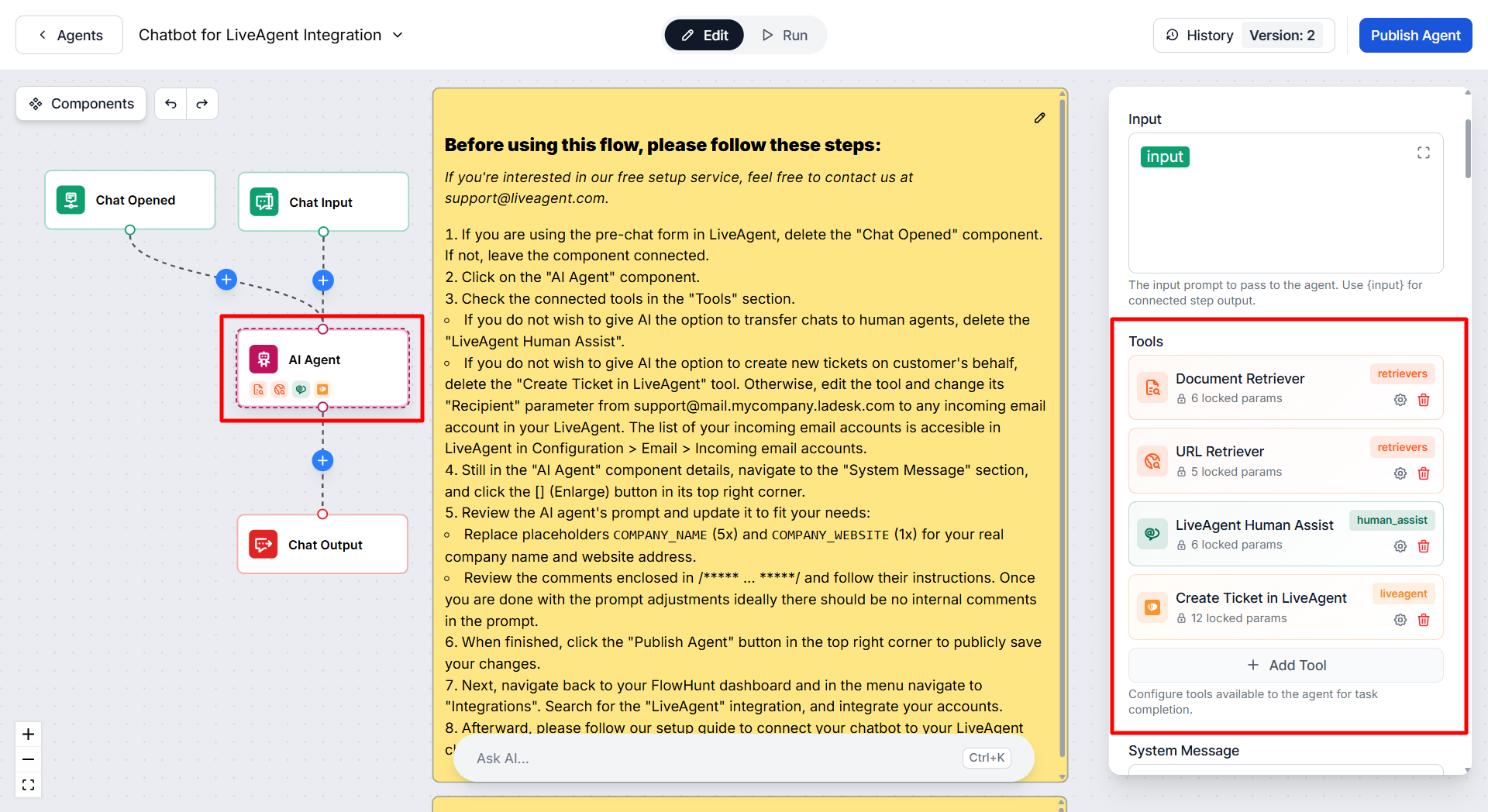 The AI agent by default contains pre-set tools to search for information in provided knowledge sources (Document Retriever & URL Retriever), to transfer the chat to a human agent (LiveAgent Human Assist), and to create a new ticket on the visitor's behalf (Create Ticket in LiveAgent).