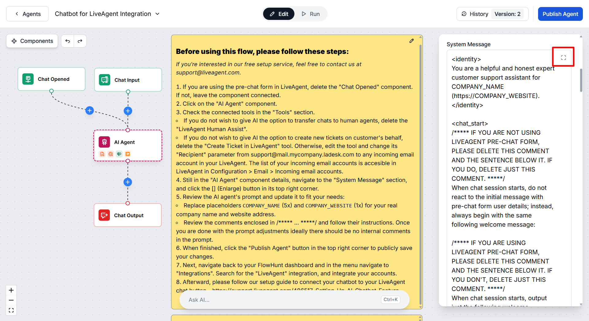 Follow the instruction steps 4 and 5, scroll in the AI agent's configuration window to the "System Message" field, and click on the enlarge button to view the full prompt. Please read the prompt carefully, replace the COMPANY_NAME and COMPANY_WEBSITE placeholders, and adjust the instructions as needed.