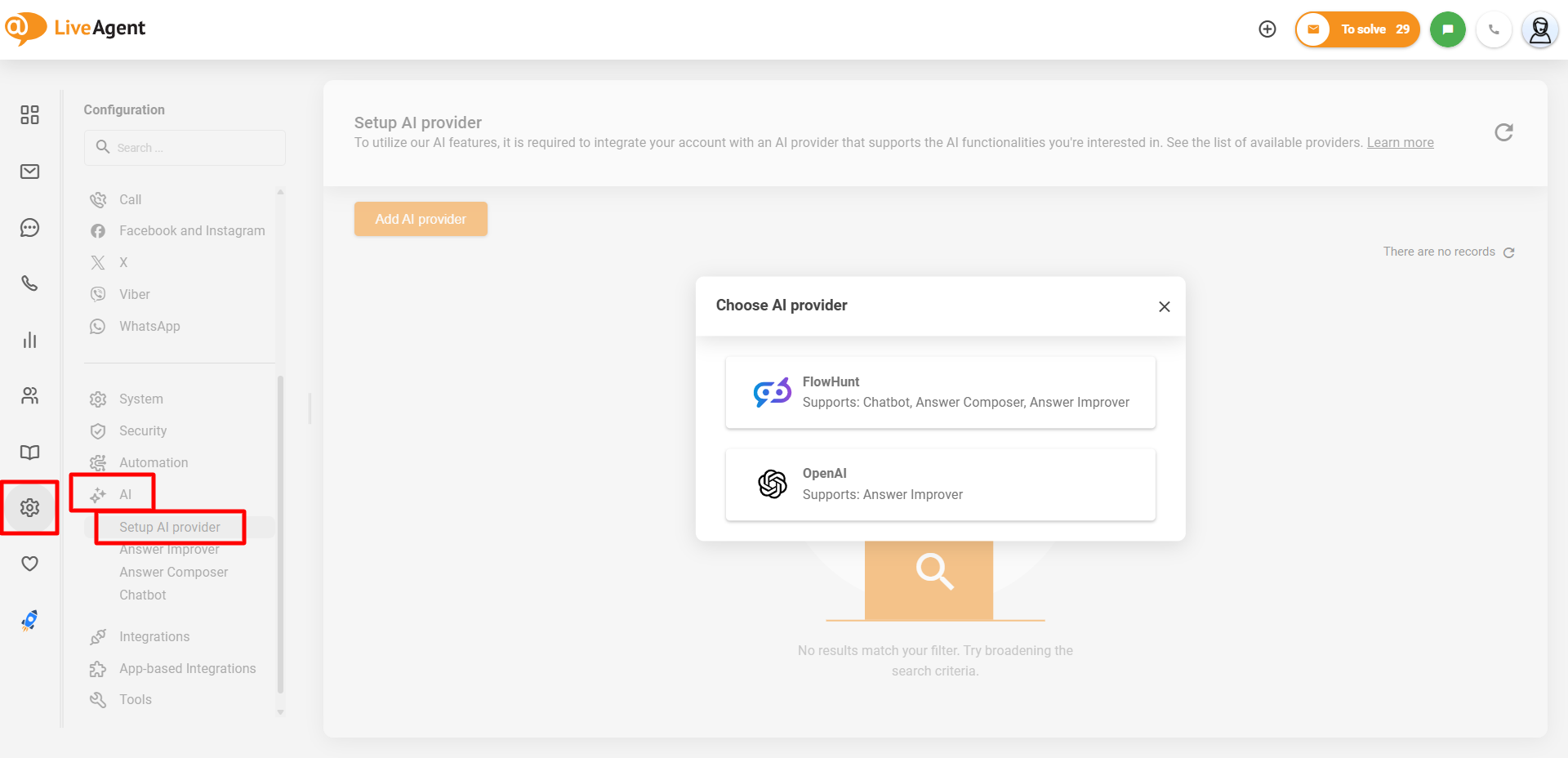 After generating your FlowHunt API key, navigate in your LiveAgent panel to Configuration > AI > Setup AI provider, click on the "Add AI provider" button, and select "FlowHunt".