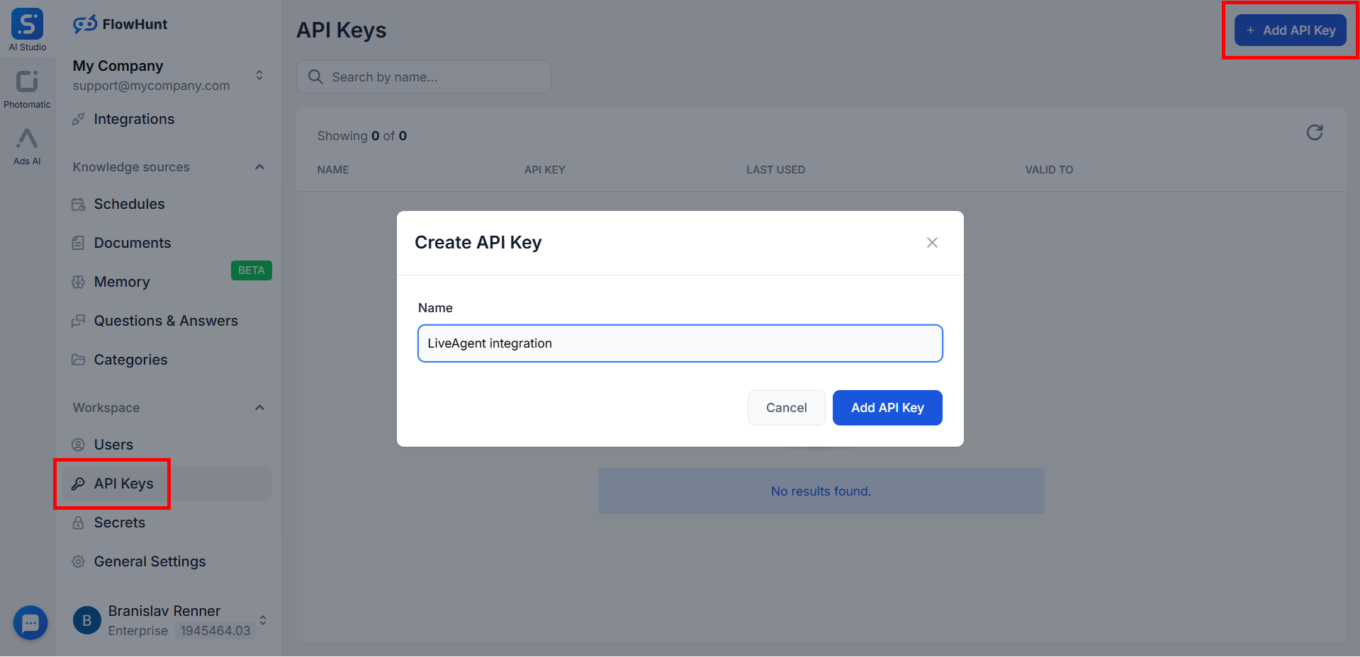 Navigate in your FlowHunt dashboard to the API Keys section and click on the "+ Add API Key" button. Name your new API key and click on the "Add API Key" button. Once you have created the new key, it will be displayed on the screen.
