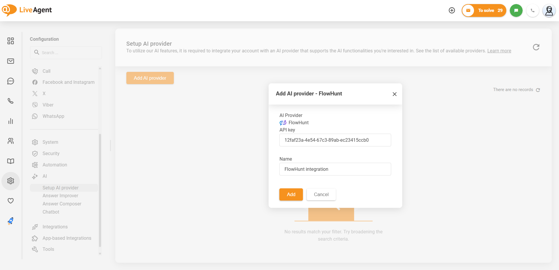 Insert your FlowHunt API key into the provided field, name the integration for easier recognition in other settings, and save the configuration window by clicking "Add". Your FlowHunt workspace is now connected with your LiveAgent and you can continue with setting up AI features.