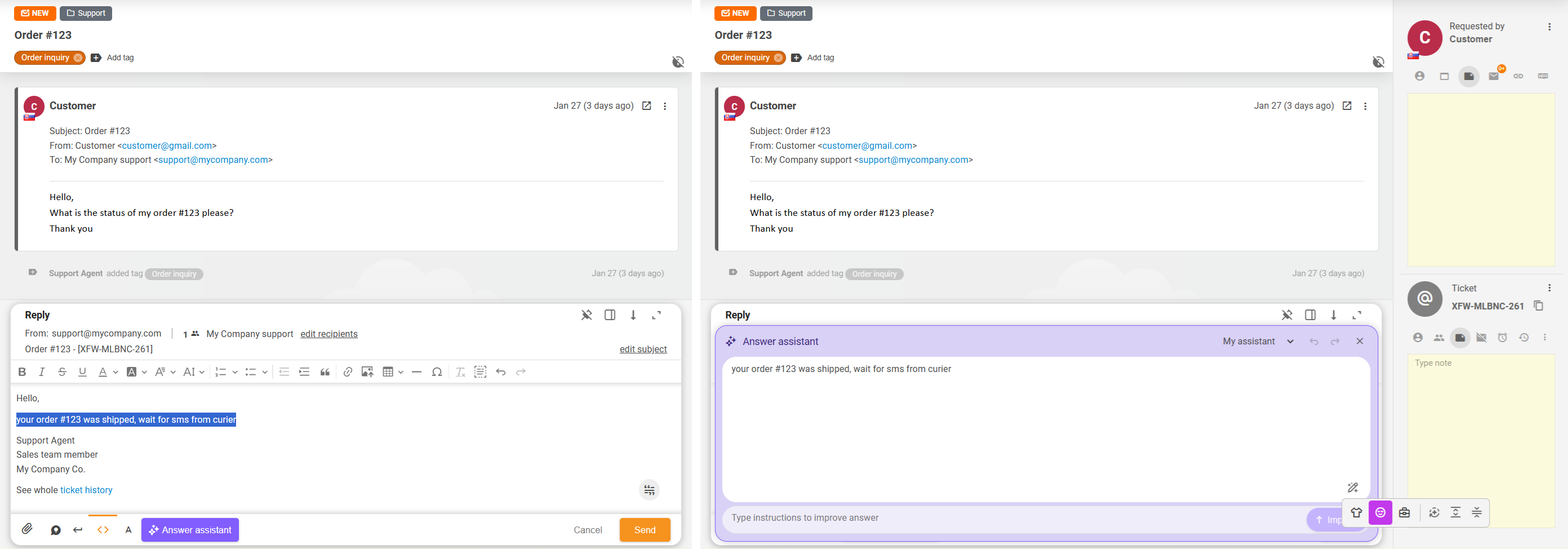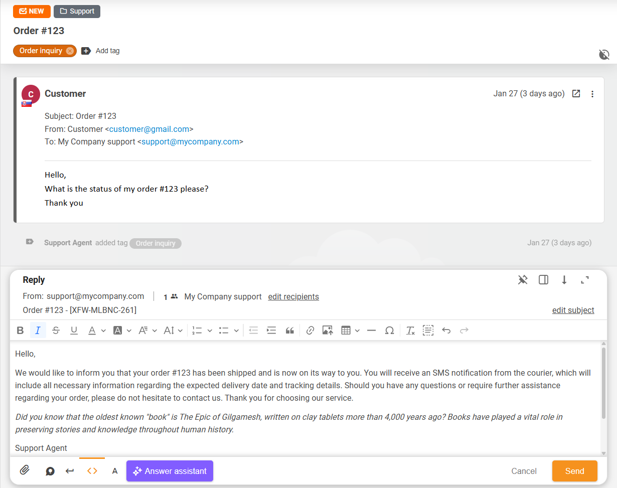 The Answer assistant feature is an AI-powered tool built into the reply editor. It helps agents to generate professional responses to customer queries & refine answer drafts based on provided instructions, supporting a wide range of AI LLM models. This article covers the vast options of the feature's functions in detail.