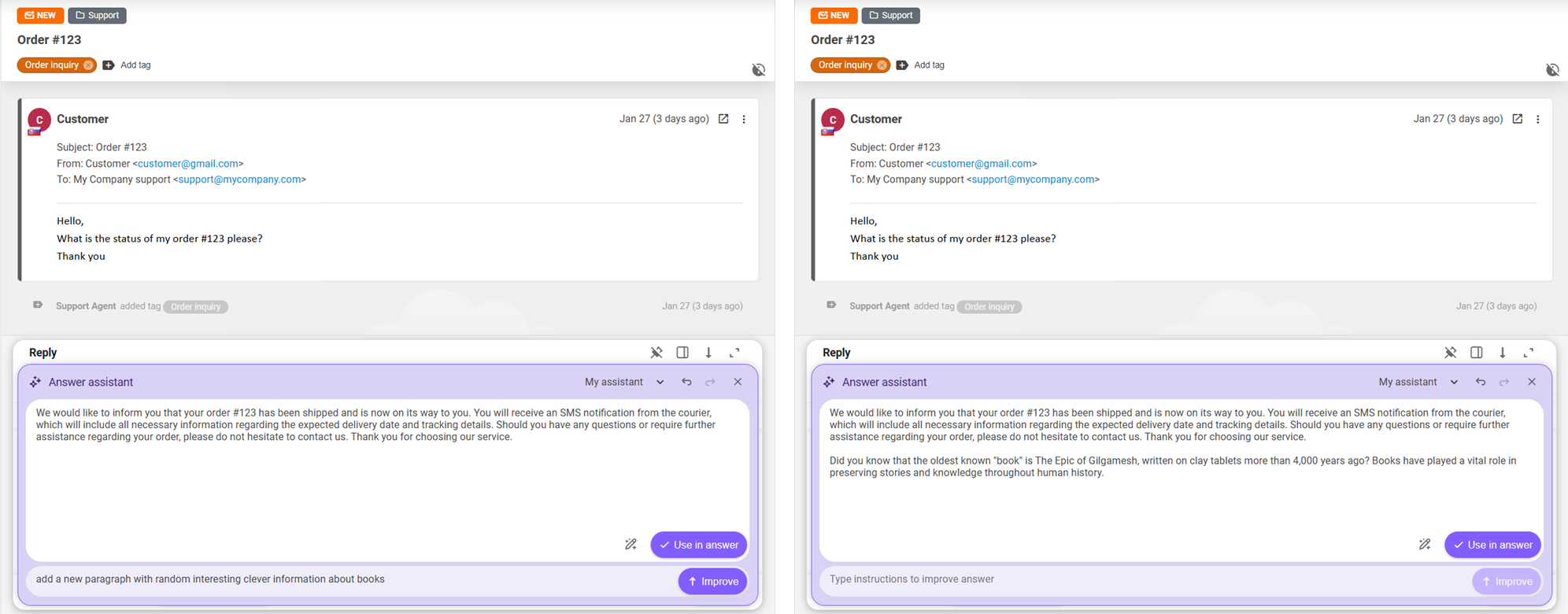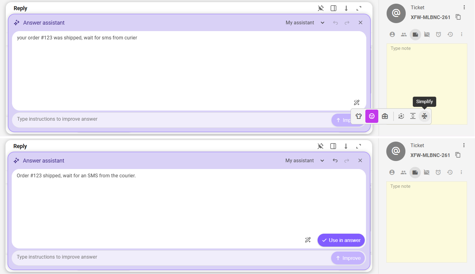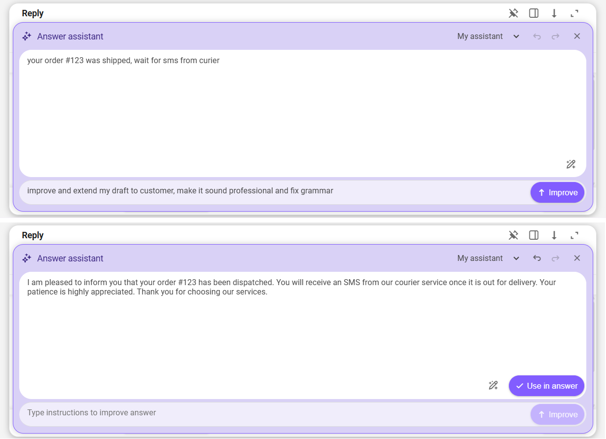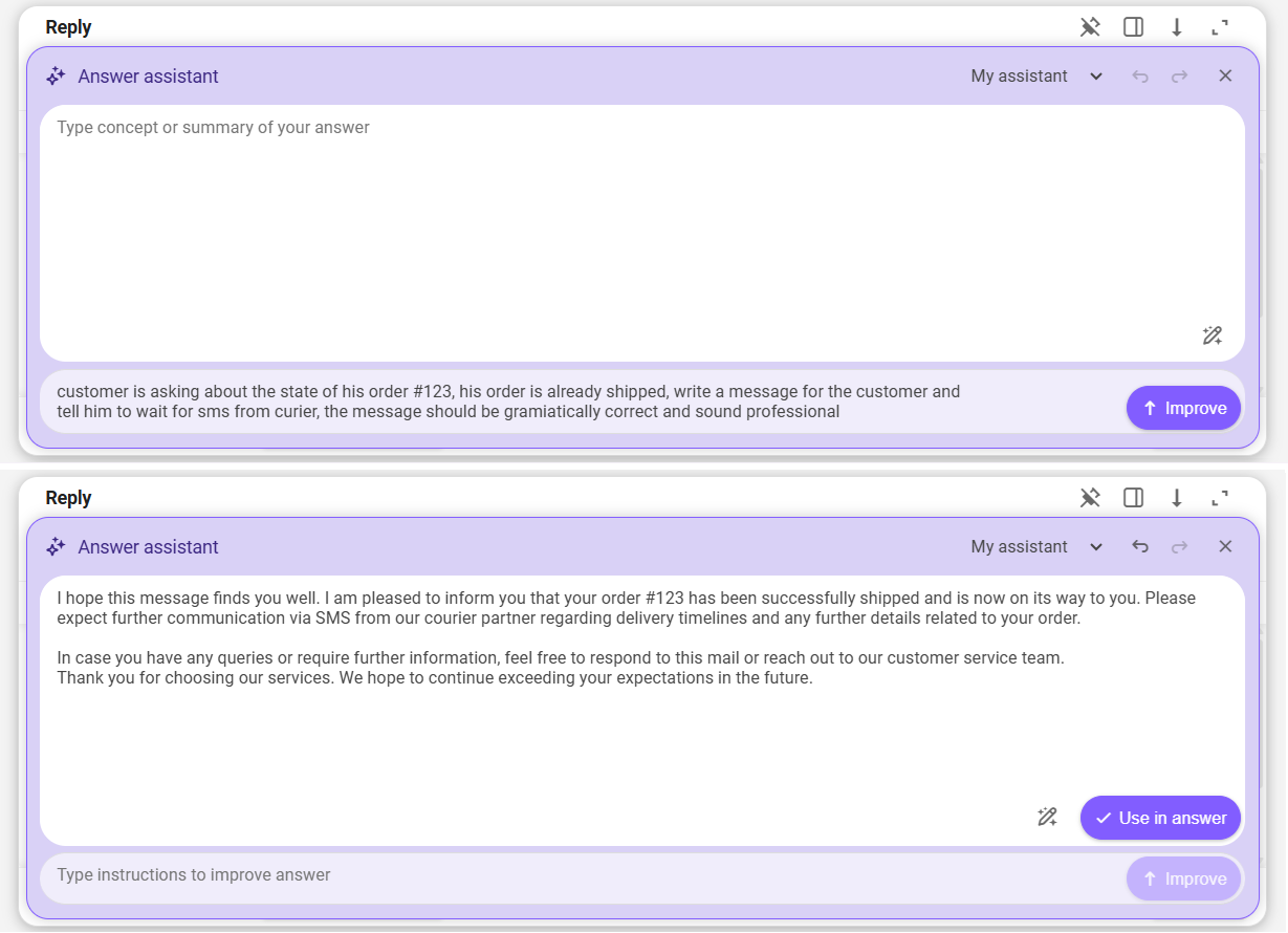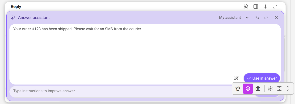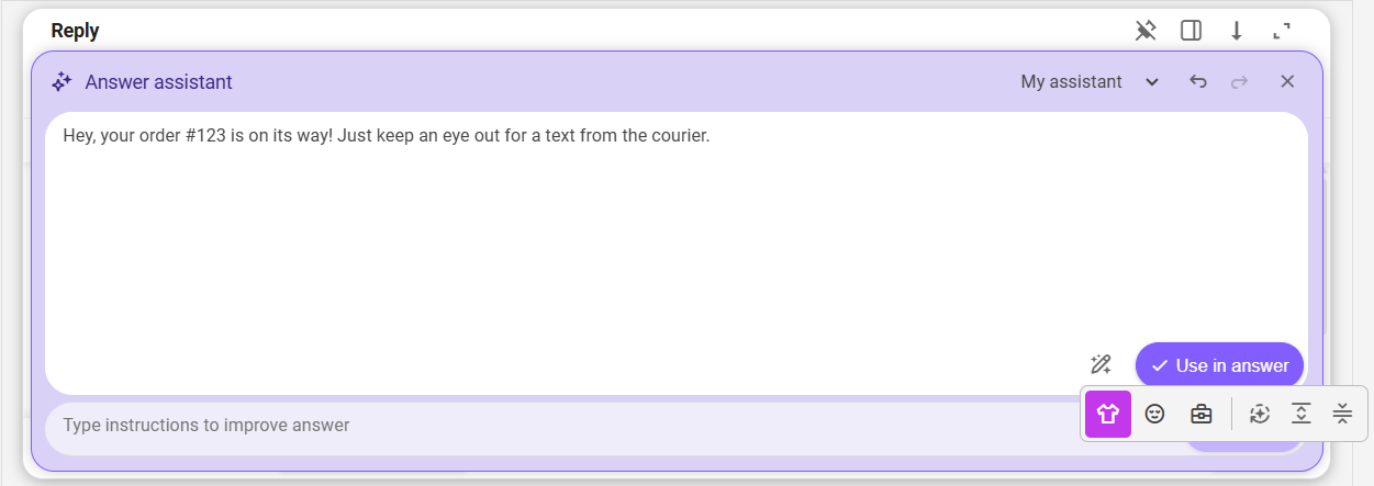 Once you are satisfied with the result, click the "Use in answer" button to pass the draft response to the ticket answer editor, from where you can send it right away.