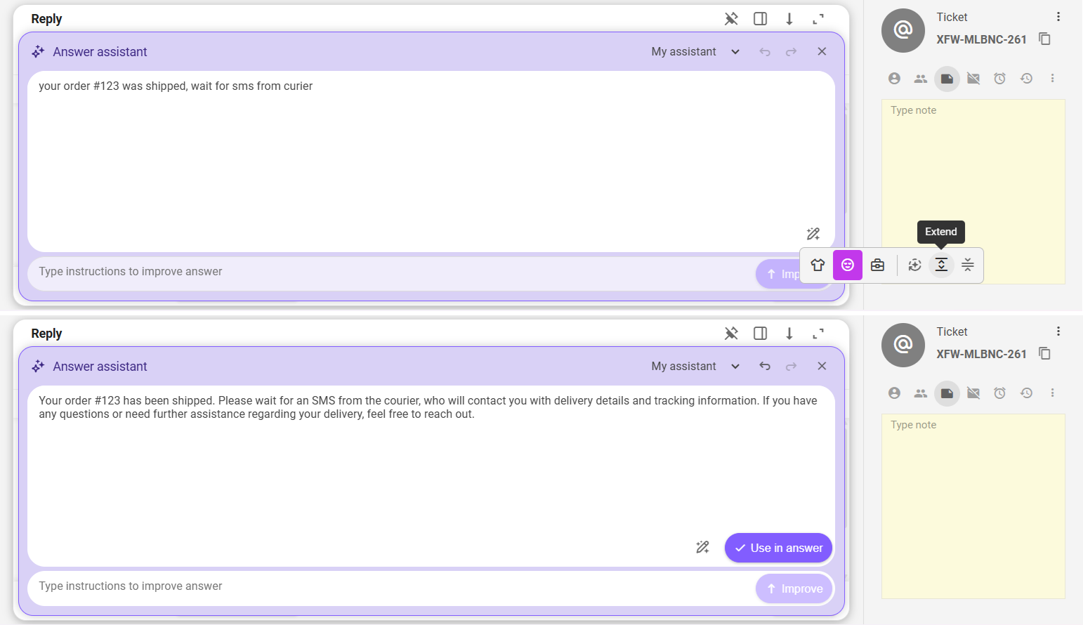 If you are creating a new ticket, or you wrote a draft answer upfront and selected it, the feature's window enters modification mode right away. This enables you to generate or refine a response by setting the formality level, and either applying one of the three predefined actions (improve, extend, simplify), or entering your custom instructions.