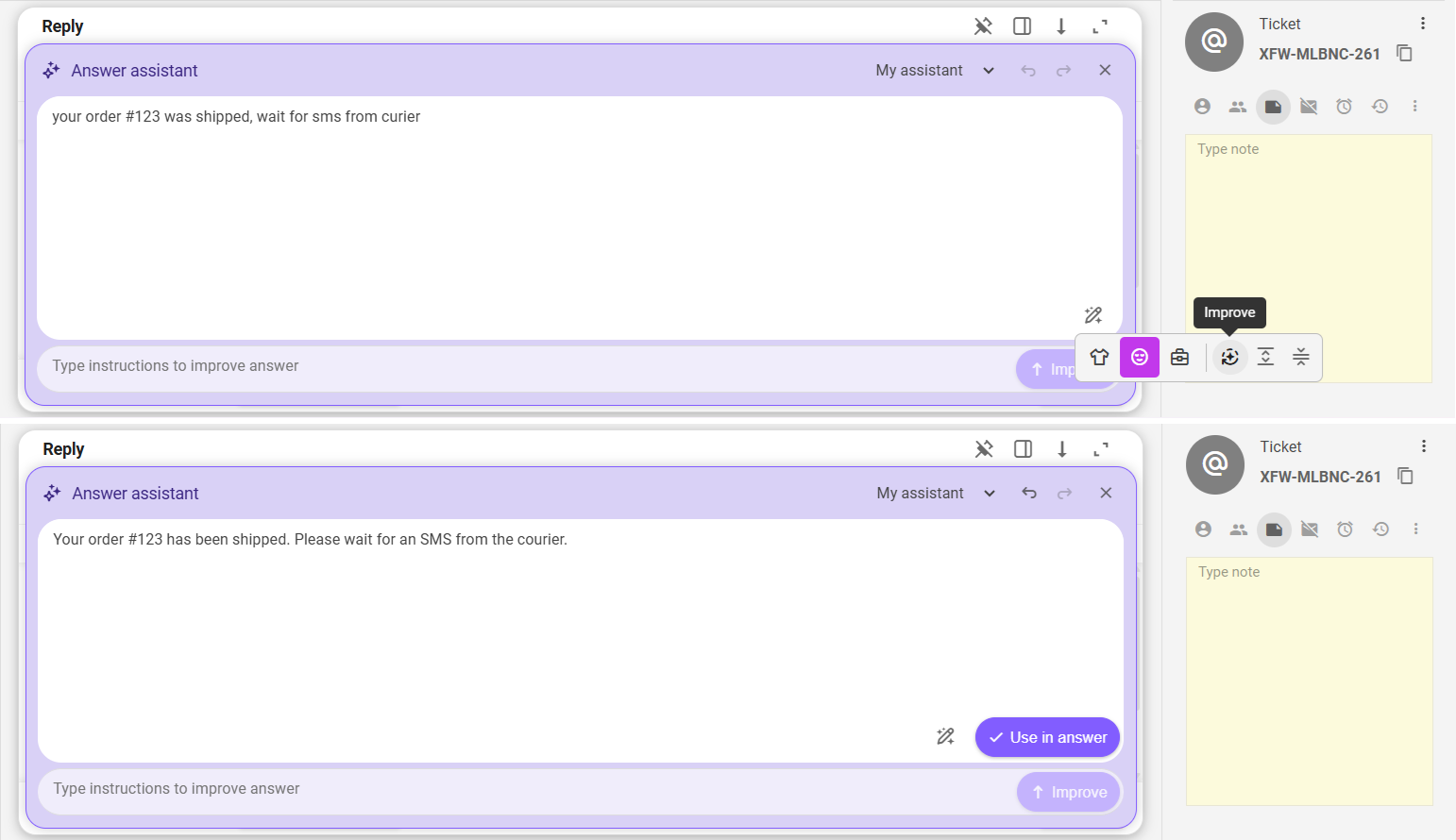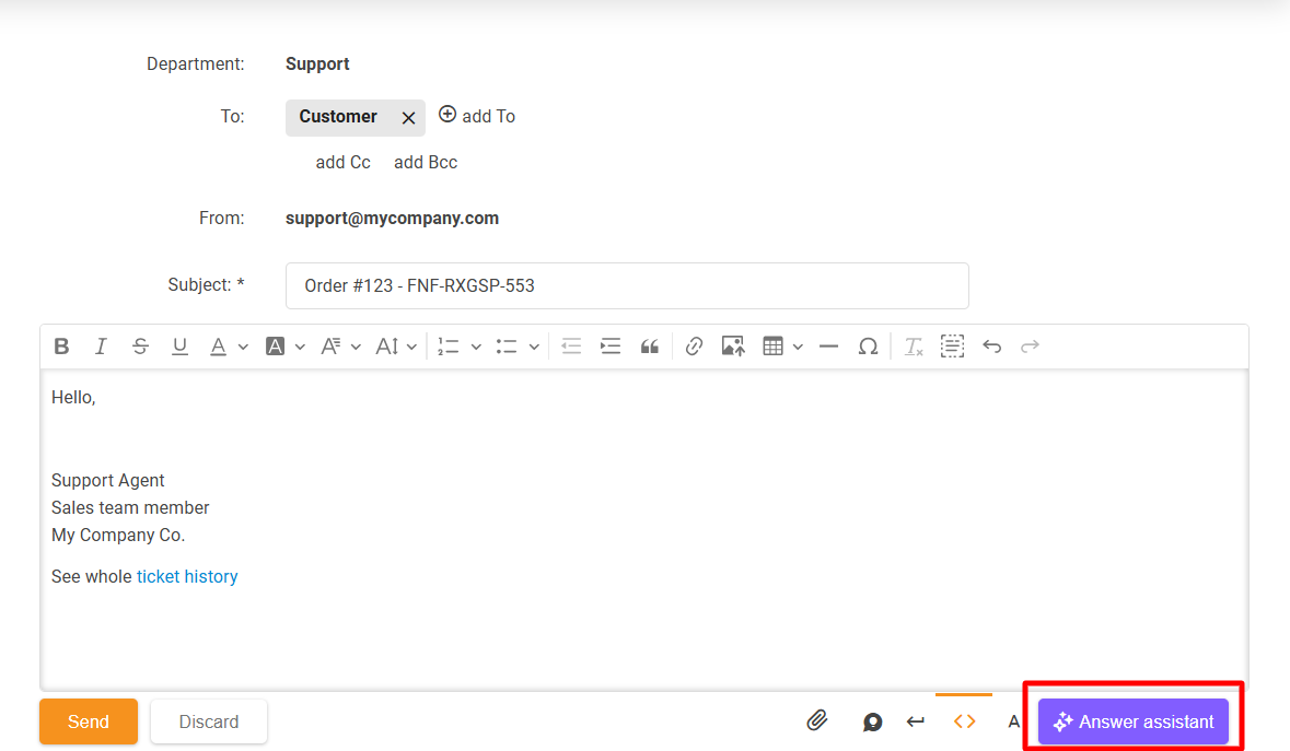 To generate/refine a draft message using AI, click on the "Answer assistant" button in the ticket reply editor when either creating a new ticket or replying to an existing one.