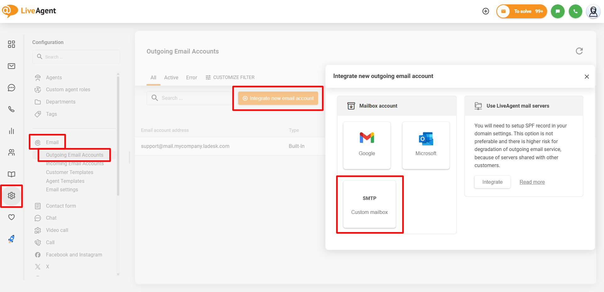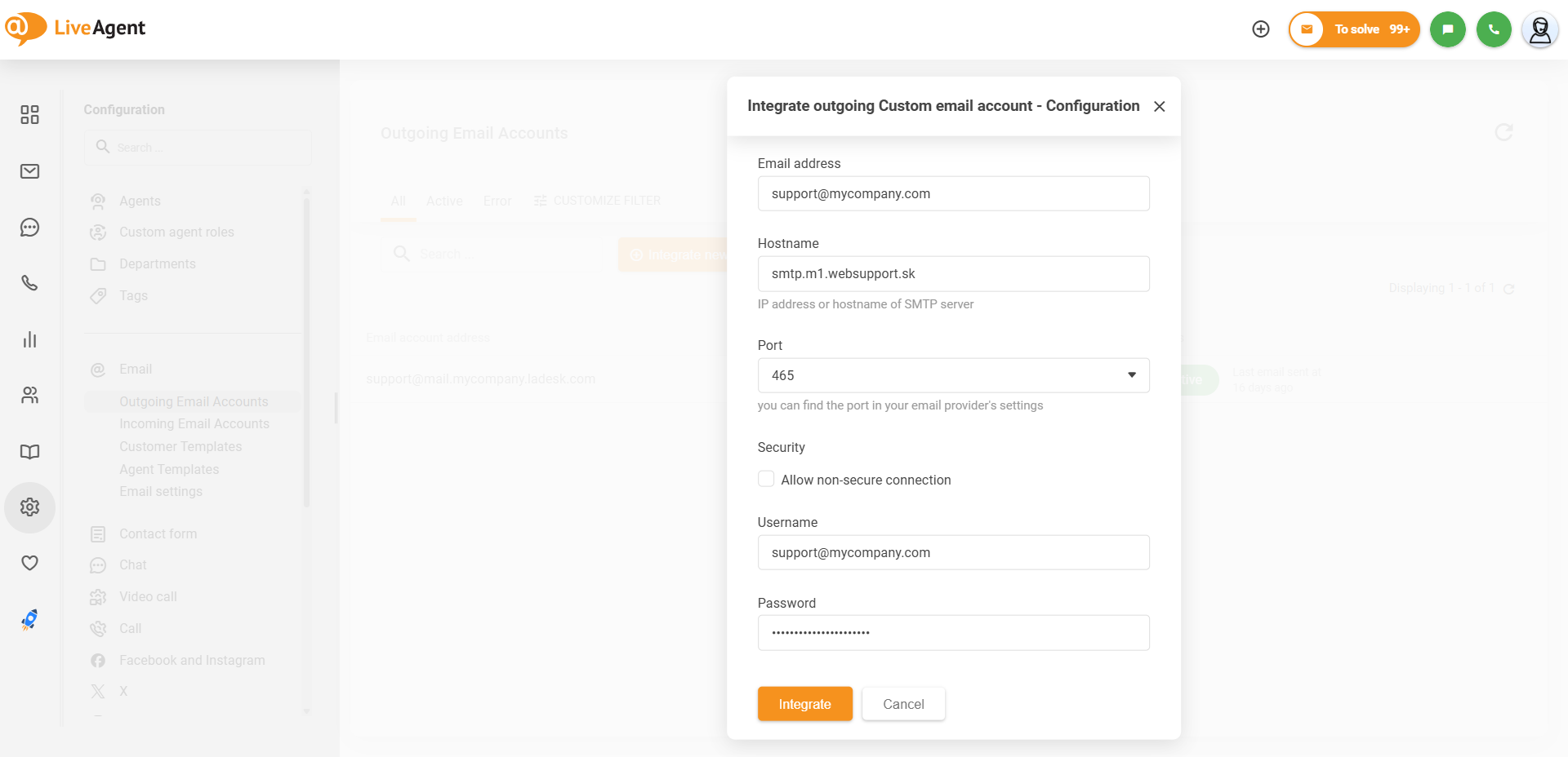 In order to use your own email address for sending emails and responding to tickets, you need to connect it to the system. Email accounts from email service providers (different than Google or Microsoft) can be connected to LiveAgent as outgoing email accounts via their SMTP credentials.