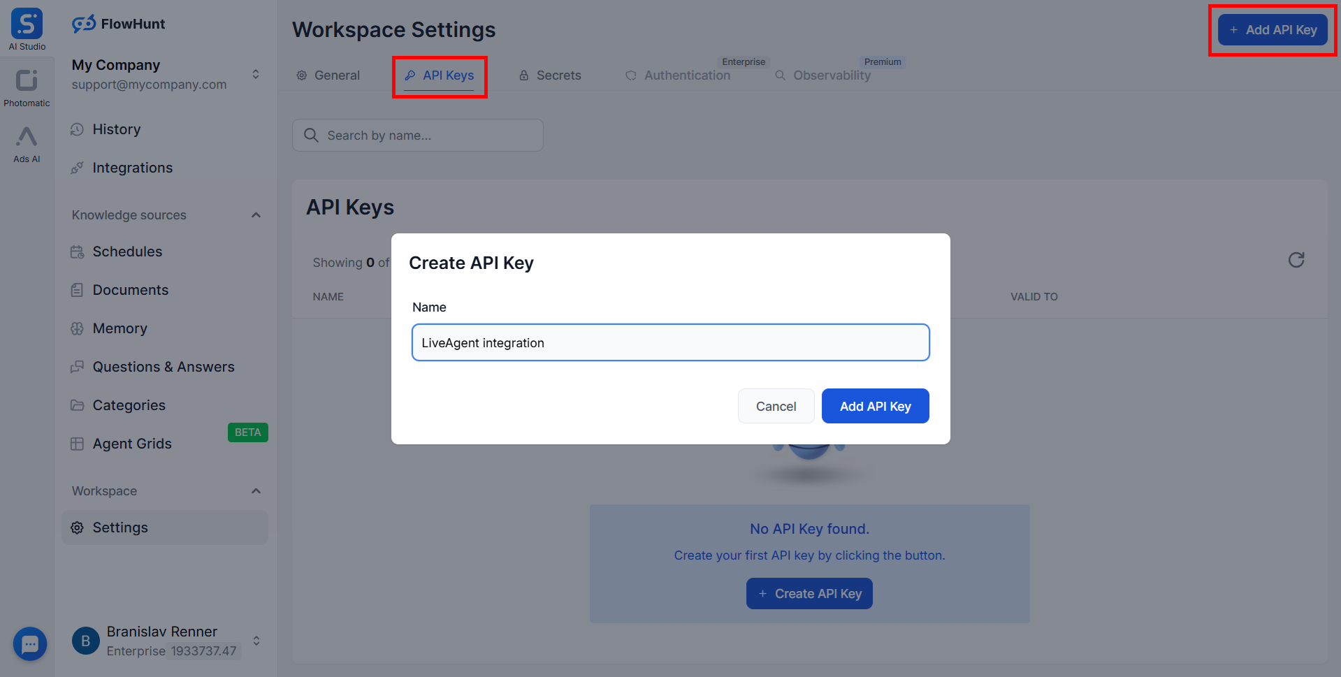 To create a FlowHunt API key, navigate in the menu to Settings. In the Workspace Settings screen, go to the "API Keys" tab, and click on the "+ Add API Key" button. Name your new API key and click on the "Add API Key" button. Once you have created the new key, it will be displayed on the screen.