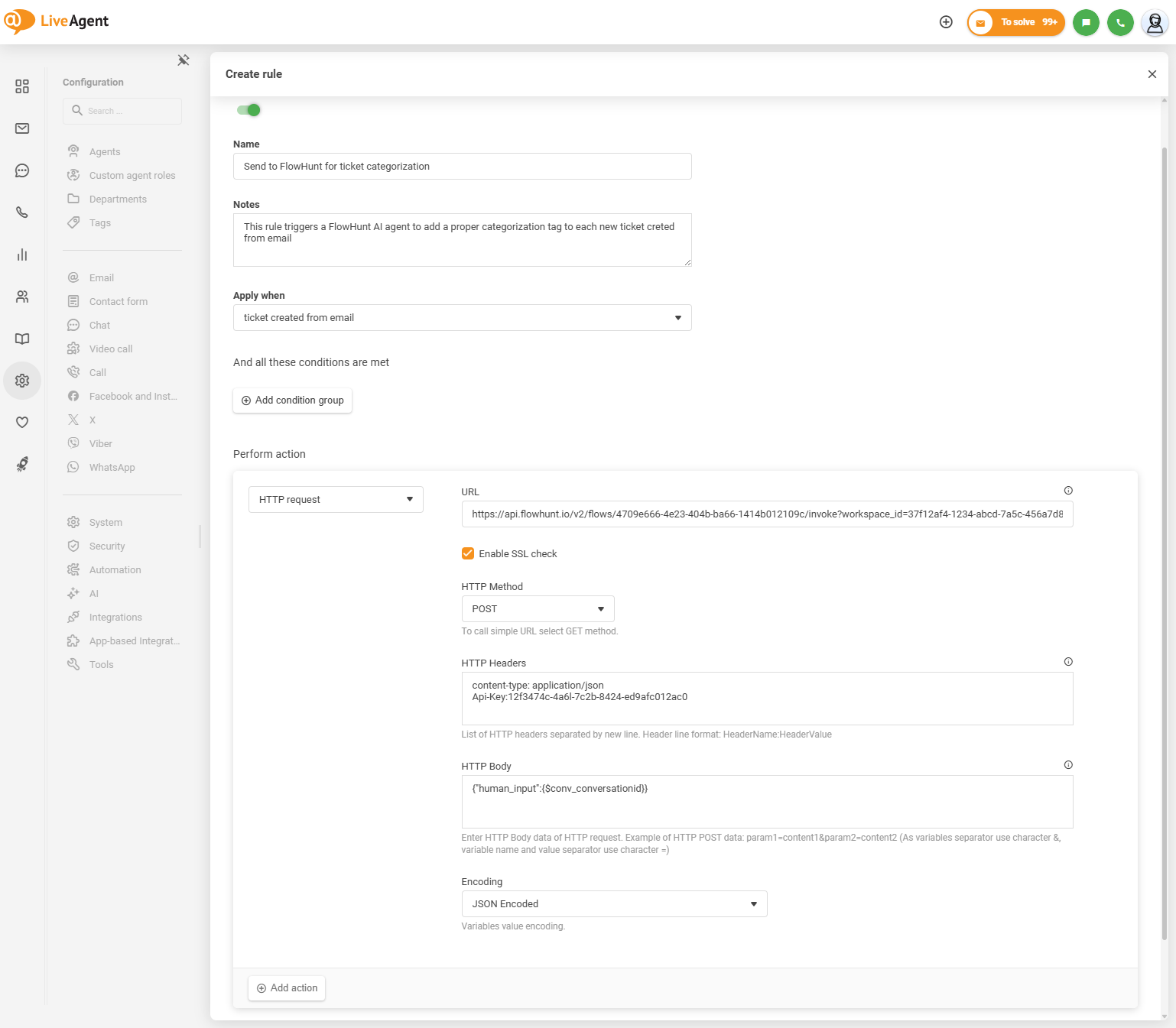 Alongside our native AI features, FlowHunt users have the ability to implement various AI agents, either selected from the library, or custom built ones, which can perform a range of tasks and automations. FlowHunt AI agents can be triggered from LiveAgent via rules, listening for various in-panel actions such as a the creation of a new ticket, a new message in a ticket, addition of a tag to a ticket, and more.