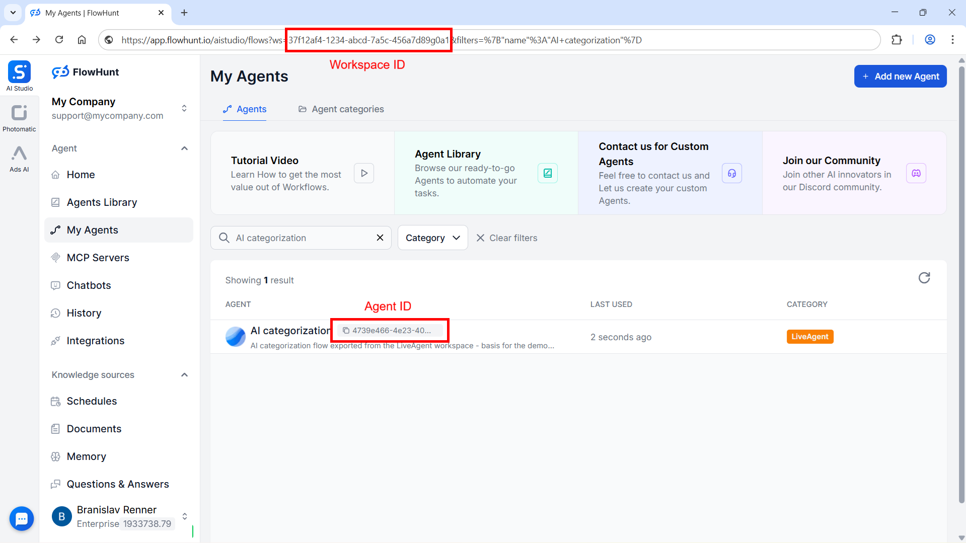 To find the AI agent ID and workspace ID values that are required in the rule, navigate in your FlowHunt account to My Agents and search for the AI agent you'd like to trigger via your LiveAgent rule. The ID of the AI agent is noted below its name.
