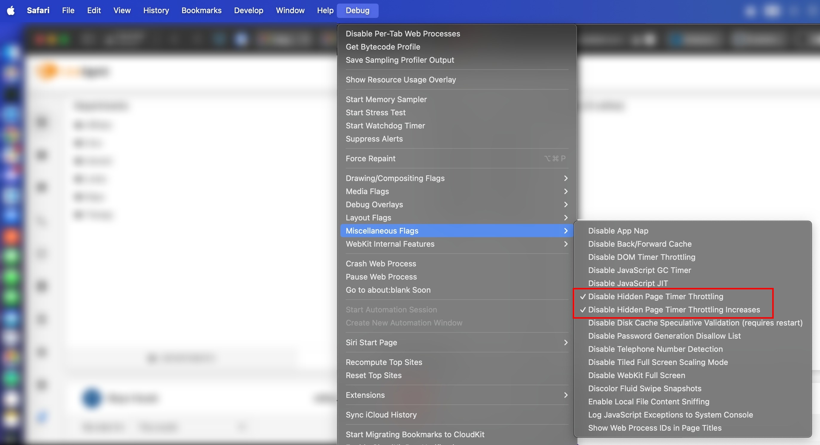 - Try disabling the "Hidden Page Timer Throttling" and "Hidden Page Timer Throttling Increases" options in Debug > Miscellaneous flags