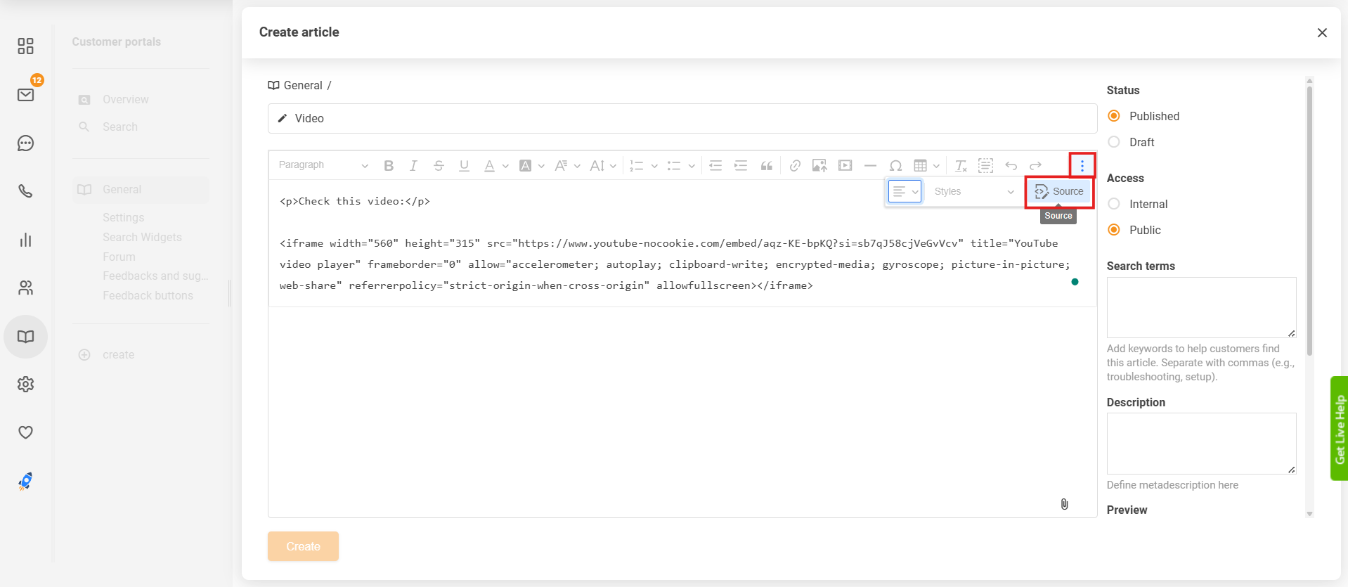 - Paste the code into your article which you can find through the Customer portal section. You need to edit the article in HTML by clicking the "Source" button in the editor panel before you can insert the code.