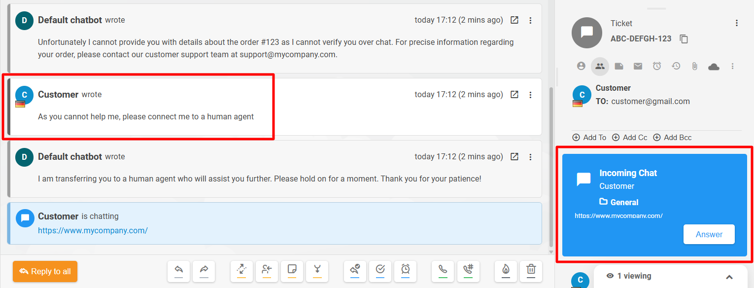 Chats with the chatbot can also be handed over to a human agent. Since agents can see & review all chatbot chats in the Chats overview section, they can intervene whenever required. The visitor also has the option to request a chat with a human agent. The transition of the chat from the chatbot to a human agent is smooth and does not interrupt the chat for the visitor. Both the support agent and the visitor have access to the history of the conversation with the chatbot within the same chat window/ticket.