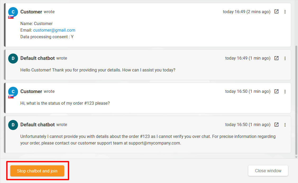Support agents can access the selected chatbot conversation ticket in the Chats overview section via the View (eye icon) button. After opening the ticket, the agent can click on the "Stop chatbot and join" button. Upon joining the chat, the conversation continues as a regular chat with a human agent.