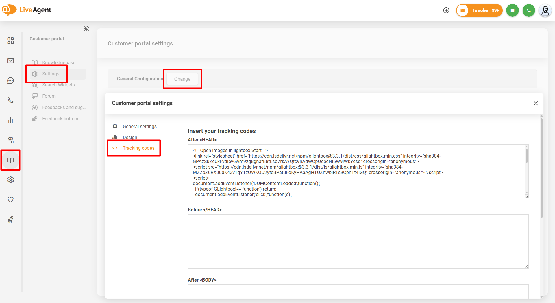To implement the lightbox functionality, navigate in your LiveAgent admin panel to Customer portal > Settings > General Configuration - Change > Tracking codes, and copy-paste the code below into the "After <HEAD>" field: